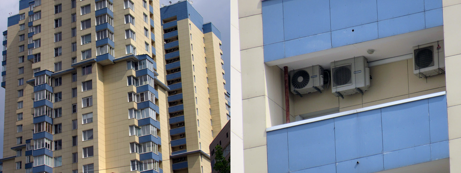 Вторая — современные многоквартирные дома, реконструированные и новые коммерческие знания, не имеющие в своем проекте специально отведенных мест для кондиционеров. Монтаж кондиционеров в таких зданиях происходит хаотично, что быстро портит впечатление от красивого фасада.