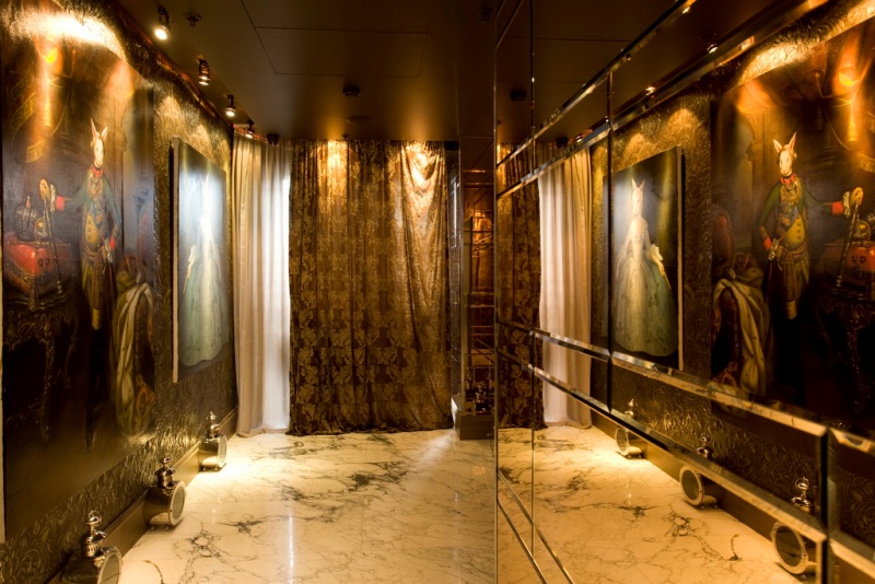 Зазеркалье начинается уже в холле: одна из стен вдоль прохода покрыта зеркальными панелями. Кролики — их изображения можно найти на стенах заведения.