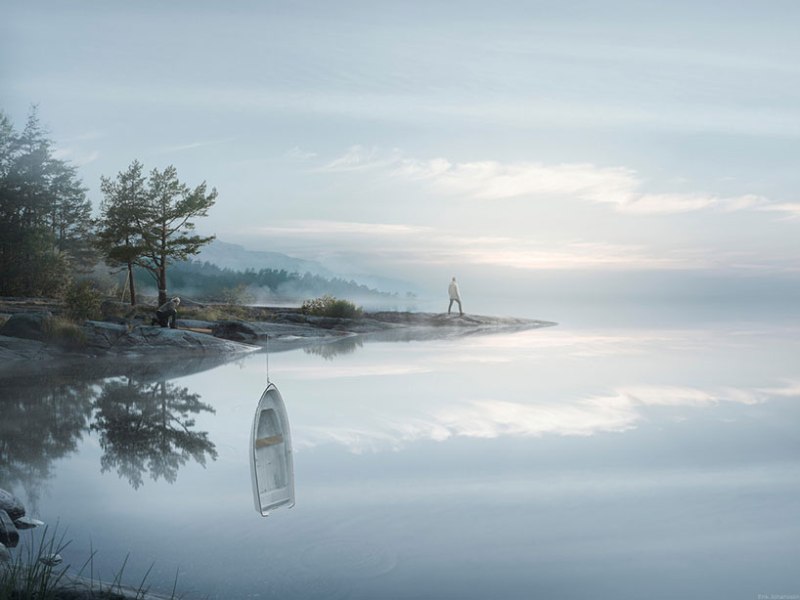 Например, работа Impact (главное изображение). Она выполнена при помощи 17-метрового зеркального полотна и маленькой лодки, точнее, ее фотографии, наложенной поверх фона. Реальность в работах Erik Johansson больше похожа на гибкое полотно, с которым фотохудожник обращается довольно бесцеремонно.