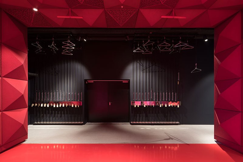 Снаружи золотистый алюминиевый фасад напоминает нам о ярких солистах музыкальных групп, а ярко-красный интерьер — бархатную подкладку гитарного кофра.