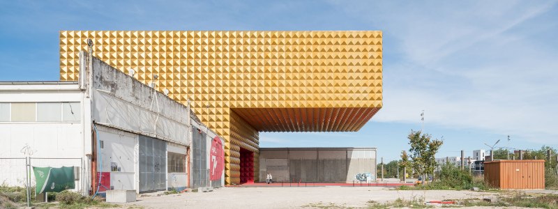 Золотистый алюминиевый фасад — напоминание о ярких солистах музыкальных групп.